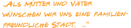 „Als Mütter und Väter wünschen wir uns eine familienfreundliche Stadt, engagieren uns für den bedarfsorientierten Ausbau der Kinder – und Ganztagsbetreuung so, dass die Bedürfnisse berücksichtigt und die Wahlfreiheit für die Eltern und Kinder erhalten bleibt. Wichtig ist uns der Erhalt und die Weiterentwicklung differenzierter Bildungsstandards.“